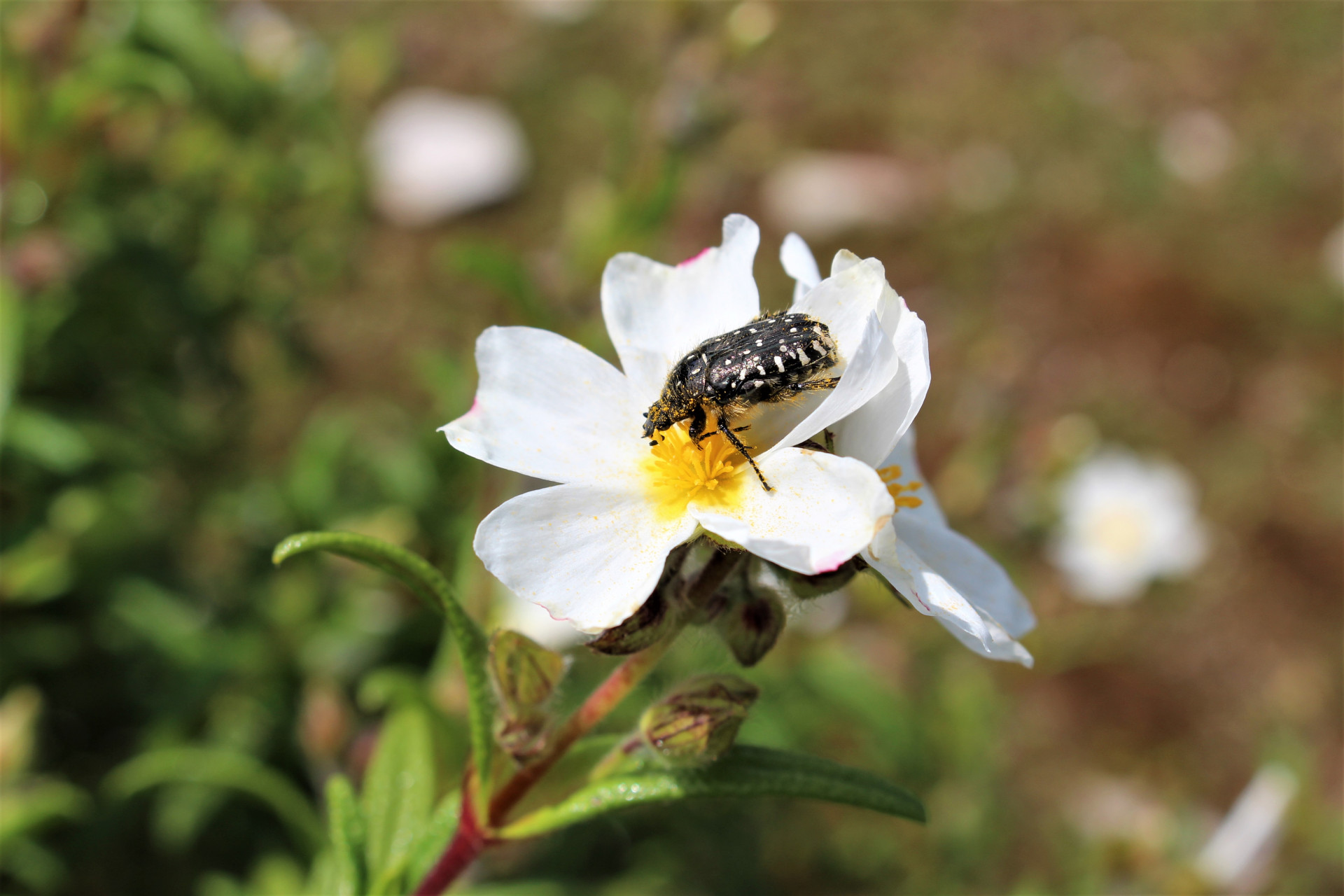 Jedna od takvih biljaka je i ljepljivi bušin (Cistus monspeliensis). Vazdazeleni grm čije je mirisno lišće ljepljivo na dodir, a sredinom proljeća procvjeta prekrasnim velikim bijelim cvjetovima. Cvjetovi su mnogobrojni i traju kratko - tek dan ili dva. Međutim, kontinuirano se stvaraju novi, tako da je grm u cvatu sve do ljeta. Ono što ćete zasigurno primijetiti oko procvalog bušina su mnogobrojni kukci – leptiri, kornjaši, mravi, pčele, mušice, svakakvih boja i veličina, a često se na njima, čekajući plijen, u zasjedi šćućure i pauci. Baš poput drugih aromatičnih i medonosnih biljaka koje često uz njega rastu, bušin je iznimno važan za očuvanje raznolikosti oprašivača.