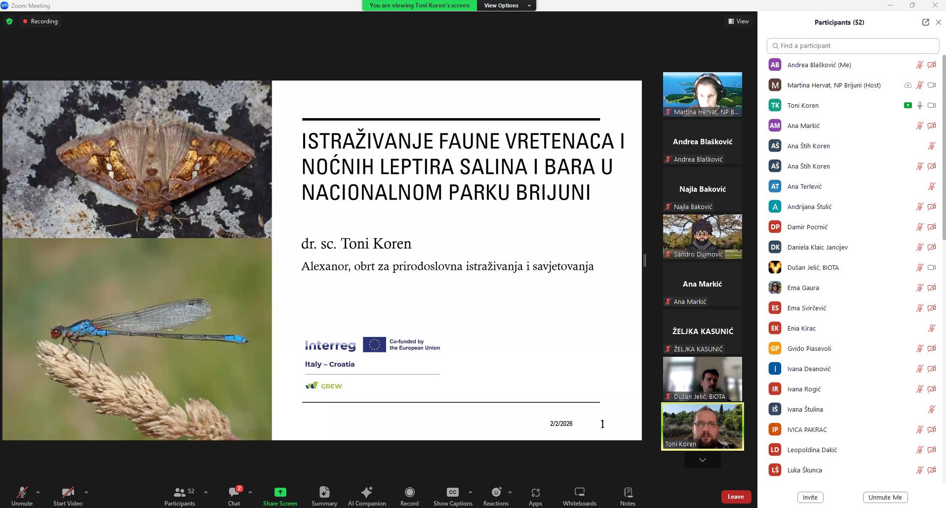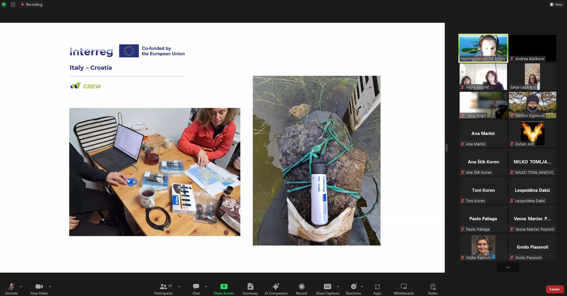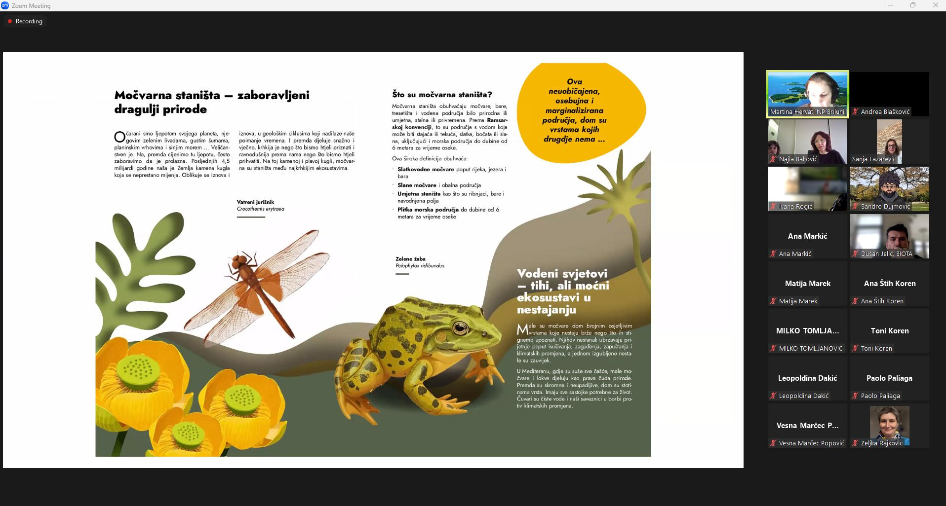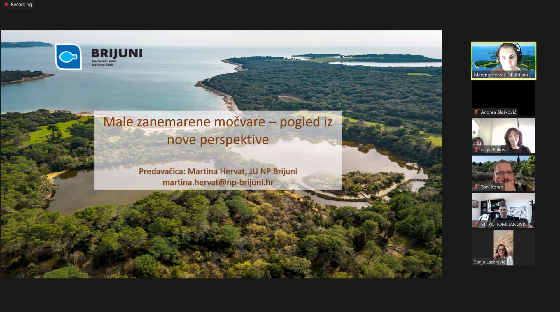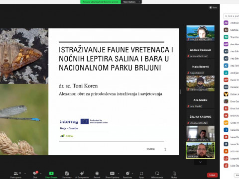 Tijekom webinara viša savjetnica Martina Hervat je predstavila aktivnosti koje se u Nacionalnom parku Brijuni provode u okviru projekta GREW, s naglaskom na praćenje stanja malih močvarnih staništa kroz pilot aktivnosti prilagodbe klimatskim promjenama. Predstavljeno je i kako se na terenu provode ekološka mjerenja, kako se u prikupljanje podataka uključuju posjetitelji i istraživači putem aplikacije GREWAPP, te kako se kroz suradnju s dionicima razvijaju zajednički modeli upravljanja močvarnim područjima kroz proces donošenja Sporazuma o močvarama (Wetland Constract).